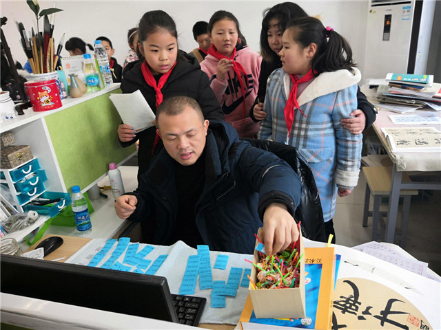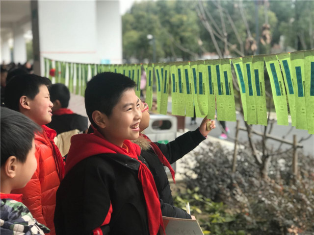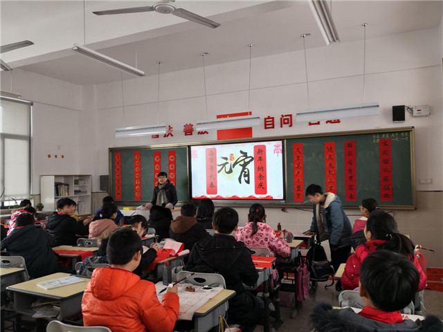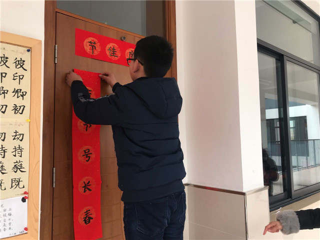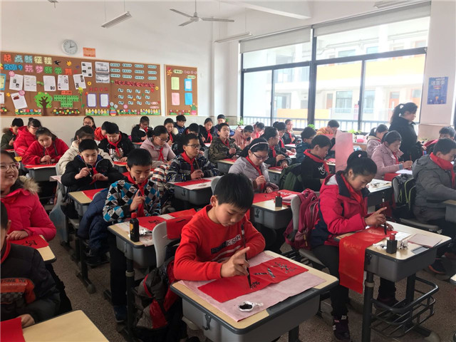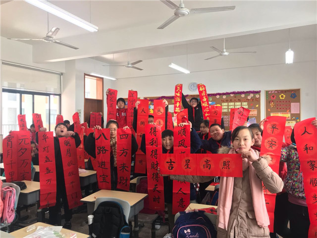 六年级教室里的孩子们正高声朗读着一幅幅精彩绝伦的对联!有的老师随后声情并茂地向大家解读。初见大气的笔迹,灵光闪现的智慧,无一不展现着车坊学子的风采!