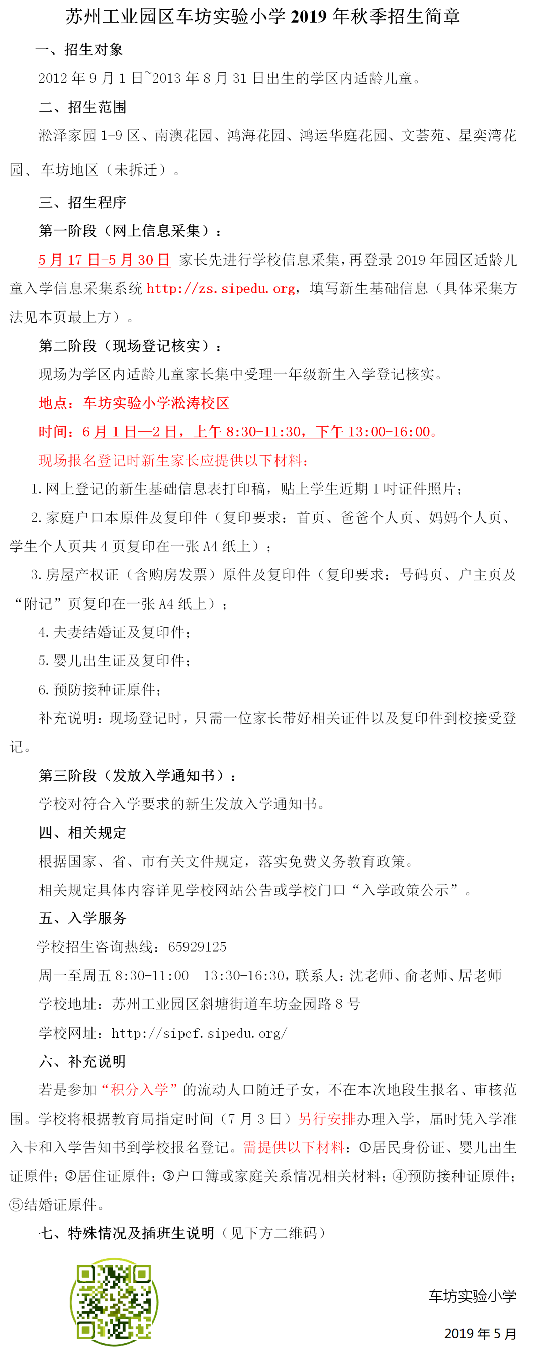 苏州工业园区车坊实验小学2019年秋季招生简章 来源:教导处 发布时间:2019-05-14 15:20:42 浏览次数: 次 【字体:小 大】 2019年新生数据采集方法:(注意:学校系统和园区易加招生系统都要采集) 一、学校采集系统(用微信扫描后,填写) 二、园区易加招生采取系统:zs.sipedu.org(采集填写注意点请扫描上方二维码) 分享到: 【打印正文】