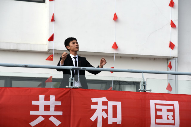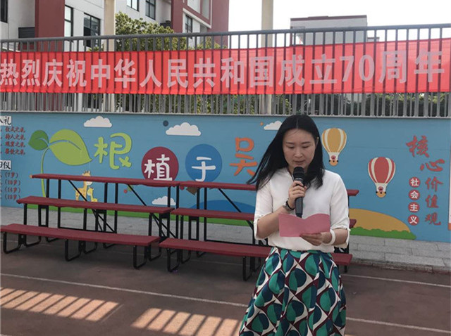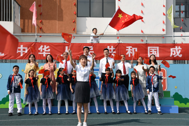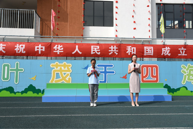 首先,全校举行了庄严的升旗仪式,鼓号队奏乐,奏响祖国的赞歌,祝福伟大的祖国繁荣昌盛!史秋磊老师、李心仪老师上台指挥全体师生唱国歌,大家用最响亮的歌声唱出对祖国的深深热爱!