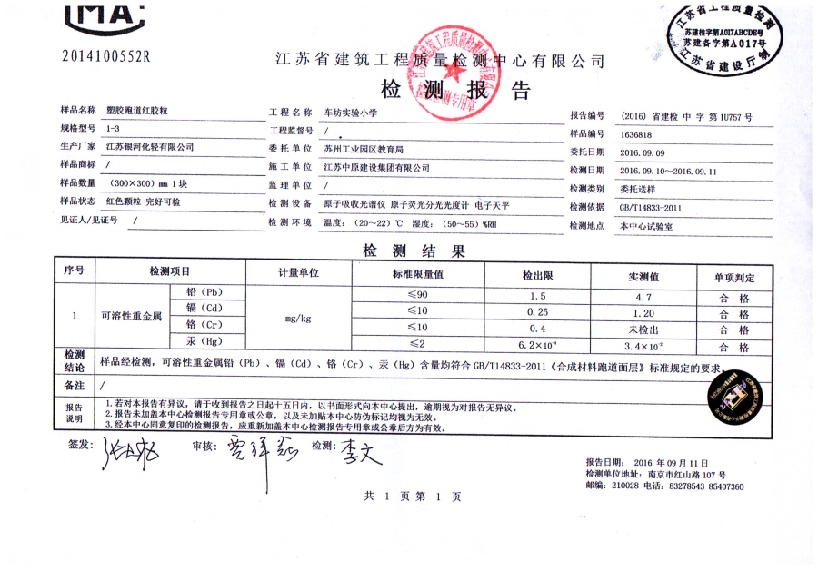 【校务公开】车坊实验小学跑道用材说明(附检测报告)(原2016年6月20日发布) 来源: 发布时间:2019-01-03 10:20:15 浏览次数: 次 【字体:小 大】 图片1图片2现场材料、施工实拍图片底层材料底层材料面层材料面层材料品牌介绍 分享到: 【打印正文】