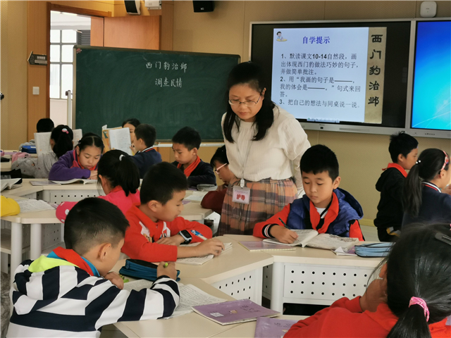 不同风格的教学,带给老师们的是一场别样的视觉盛宴。嵇尚娴老师执教六年级《童年》阅读课。嵇老师以人物、情节、环境为线索,以成长为主题,注重对学生语文素养的培养,借助现代教育技术,运用开放创新的教学方法,激励学生自得、自悟,主动积极地构建知识。束会琴老师执教四年级课文《西门豹治邺》,束老师不仅注重文本的分析,还重视课外的拓展与语文能力的养成,抓住了学生的心理特点,有效调控课堂,让学生自由地想象与表达,课堂气氛生动活跃。