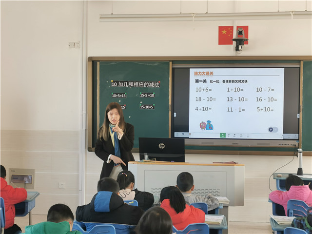陆弘睿老师执教《10加几和相应的减法》。她教学准备充分、教学组织有序、教学设计合理,教学重点突出。重视算理的教学,通过多种形式的计算练习,巩固算法,熟练计算。
