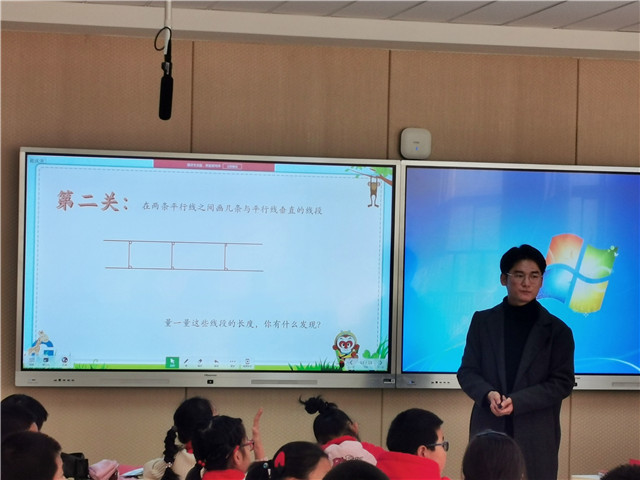 王盛老师执教《认识平行线》。王老师的课设计巧妙,内容丰富又直观,扎实而又有效,带领学生用画一画、摆一摆、折一折的方法创造出平行线,给予了每个学生参与的机会。王老师还带领学生找一找生活中的平行线,让学生感受到数学在生活中的价值。