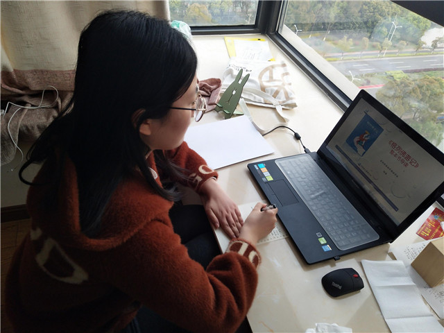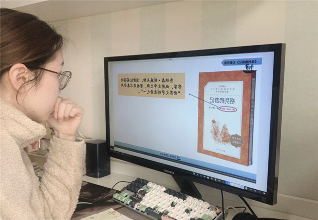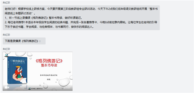 语文组老师在线观看录播课《格列佛游记》整本书导读,老师们看后积极制作名著阅读推荐卡,在线相互交流。