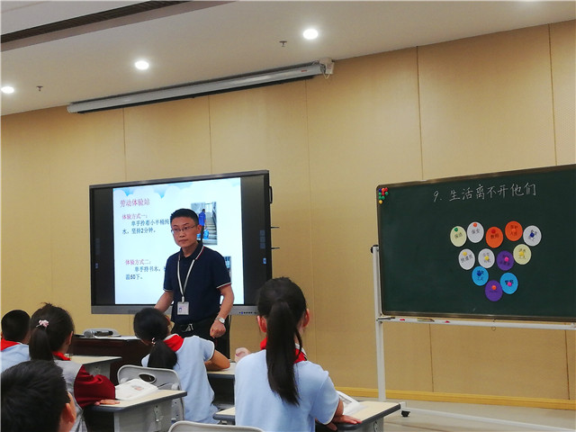 区教坛新秀赵晓峰老师执教四下道法《生活离不开他们》。赵老师抓住疫情的热点,引导学生观察和调查身边劳动者的生活,并尝试体验。让学生知道劳动者身上的责任与提当,感受劳动者的艰辛苦,表达对劳动者的尊重与感谢。区德育带头人杨伟根老师对这堂课从知、情、意、行等方面进行了深入地点评,充分肯定了这堂课的多个亮点。赵老师借助疫情热点,让每个学生深入身边调查、体验,并结合多段视频,全方位引导学生学会对劳动者的尊重和感谢。