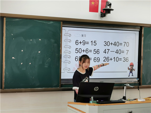 数学组的几位老师带领孩子们徜徉数字的海洋。陆弘睿老师执教的《两位数加两位数(进位)》一课,以光头强邀请同学们到大森林游玩的生动情境入手,牢牢吸引住同学们的注意力。通过引导说明竖式的运算,再通过领读、齐读等形式让孩子牢记两位数加两位数进位加法的竖式计算,整堂课生动有趣,课堂气氛活跃,同学们都收获颇深。