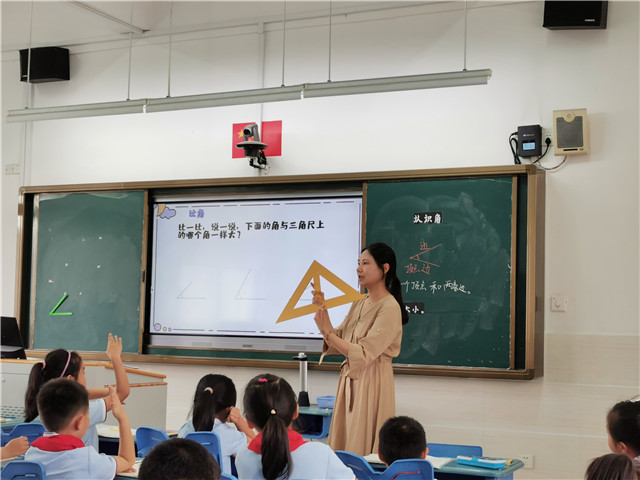 袁蕴闻老师《认识角》,结合生活情景帮助学生认识角,知道角的各部分名称,层层递进,学生经历感受角,辨角,找角,数角,做角的过程,知道角有大小。通过动手操作,掌握比较角的大小方法,会用重叠的方法比较角的大小。最后带领学生一起欣赏角,体会角在生活中的妙用,贴近生活,帮助学生在生活中学数学。整节课学生参与度高,课堂氛围活跃。