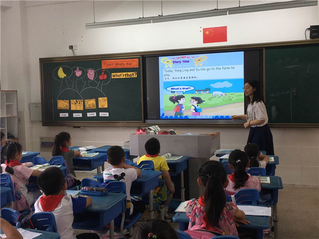 英语组王嘉仪老师执教一年级 《U7 What’s that?》,她利用农场的场景导入新单词pig、cow、duck以及lamb,同时通过学过的单词,进行新句型“What’s that”的操练。课文教学中,引导学生总结归纳“What’s this”和“What’s that”的区别,帮助学生更好地理解和记忆。学生课堂参与积极,表现活跃。