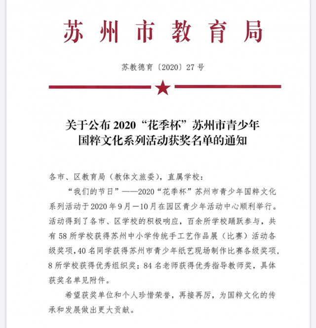 近日,在苏州市教育局主办的“我们的节日”——2020“花季杯”苏州市青少年国粹文化系列活动成绩公布,苏州工业园区车坊实验小学荣获多项佳绩。