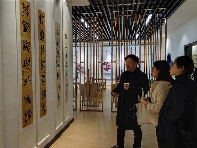 中午,庆旭带领各位学员参观了学校的视觉艺术中心,并对所展示的作品进行点评。