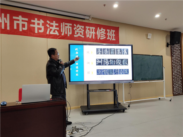 下午苏州市书法家协会秘书长朱树民给学员讲解欧体临摹与创作,以欧颜褚三种字体进行比较,深入分析欧体的字形特征。