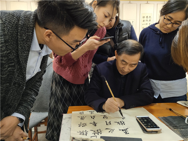 王伟林也跟学员们分享了书道之魅及习书之乐,整个讲座让人受益匪浅。讲座结束后,王伟林还拿出长卷给学员们近距离欣赏,并向众人讲解作品当中的绝妙之处。