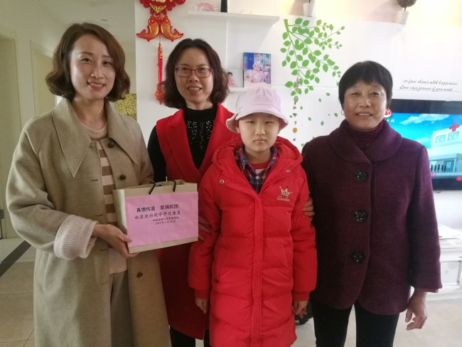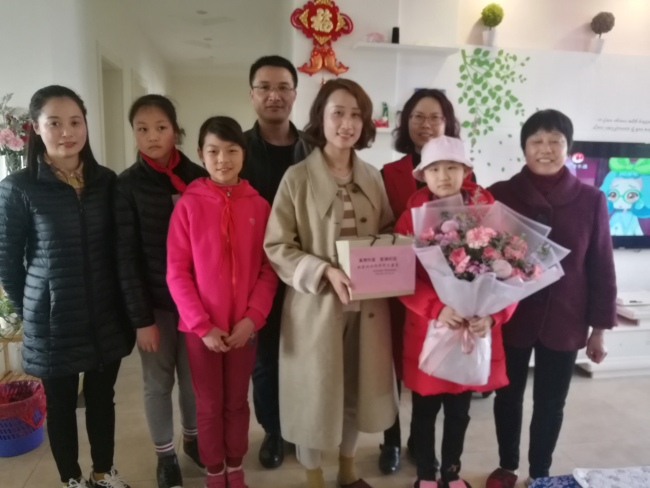 一束鲜花,几杯清茶,暖暖的祝福,翁欣怡同学脸上露出了久违的笑容;同学情,师生情,一人有难众人帮,车坊实小是一家!