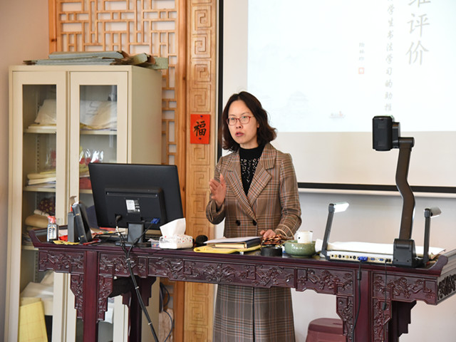 其次,陆校长进行关于《多维评价》的讲座,她指出,多维评价即是中小学生书法学习的助推器,多维评价包括评价内容、评价主体、评价客体以及评价方式,并分别对其进行了细致地讲解。