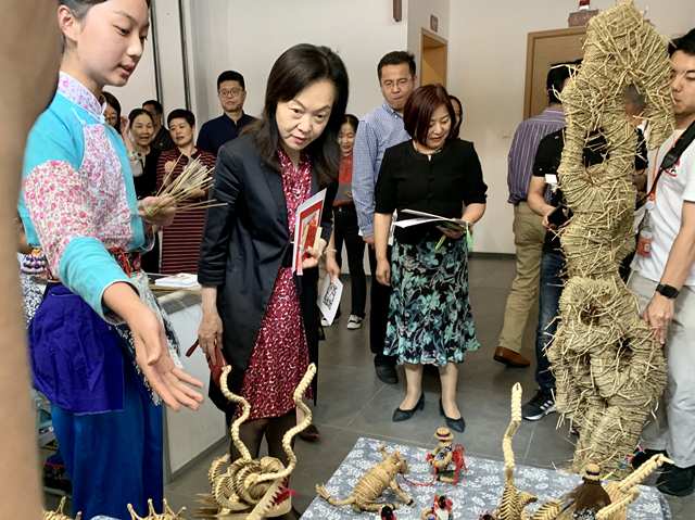 苏州工业园区管委会副主任夏芳莅临展区前,与车坊实小草编艺术实践工作坊学生亲切交谈。