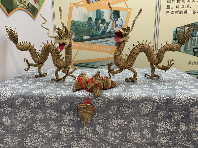 此次展览的草编作品有《双龙戏”粽“》、《端午赛龙舟》、《打连厢》等,车坊实小师生们用芊芊巧手,将水乡植物蔺草,编织成了一件件生动有趣的作品,形象的将江南水乡人们过端午的习俗展现出来,吸引了众多师生驻足观赏。学校草编艺术工作坊的几个小娘鱼,还当场教授前来参观的师生草编技法,体验非遗工艺带来的快乐。