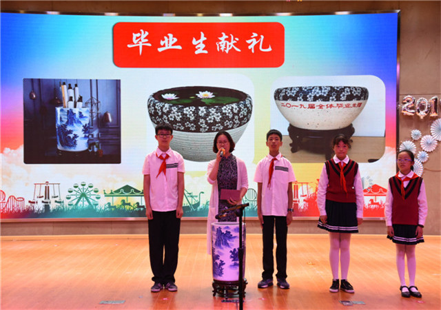 满载多年采撷的累累硕果,毕业生们就要离开了,为表达对母校的感激与祝福,全体毕业班的学生为母校献上了精心准备的毕业礼物——轴画缸。随后,学生代表向六年级所有任课老师献上鲜花,21位毕业班老师满怀激动与不舍,对即将离开母校的他们深情寄语:海阔凭鱼跃,天高任鸟飞,祝你们心怀鸿鹄之志,坚持梦想,实现梦想!
